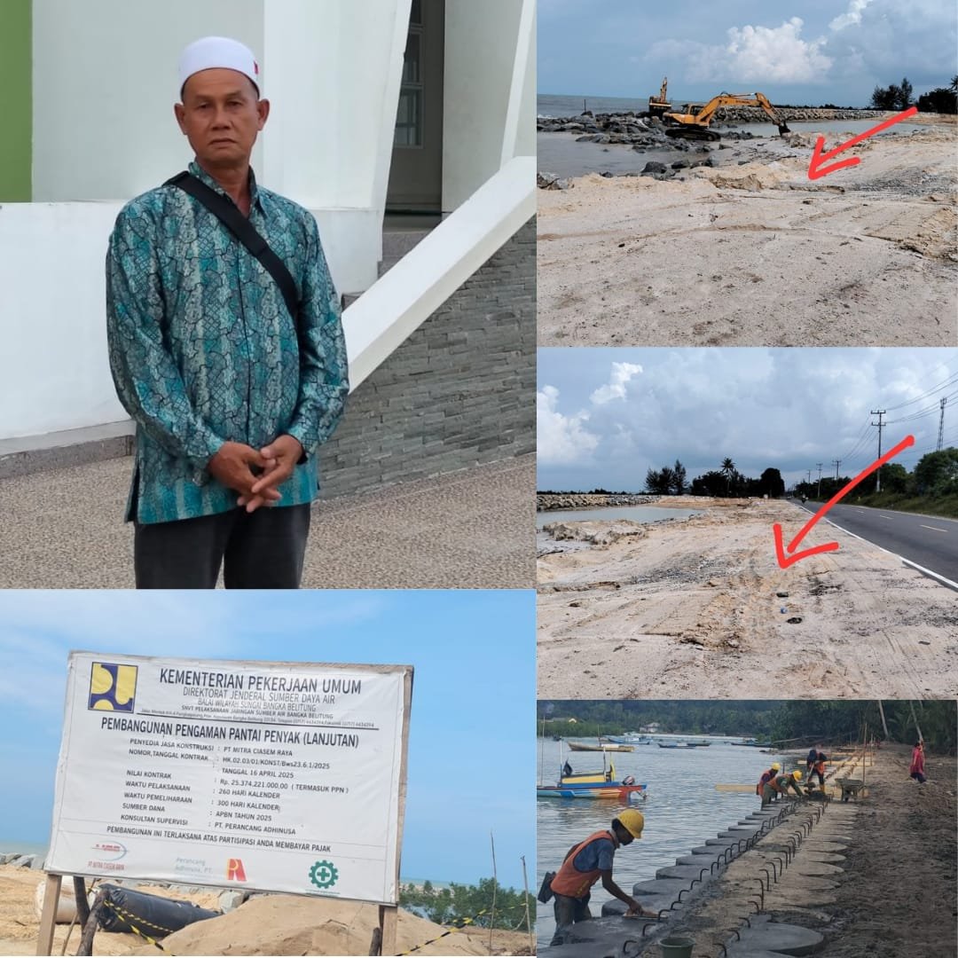 Untuk diketahui pembangunan proyek pengaman pantai Penyak dikerjakan oleh PT. Mitra Ciasem Raya dengan Pagu dana 25.milyar lebih APBN tahun 2025 dengan Konsultan Supervisi PT. Perancang Adhinusa.
